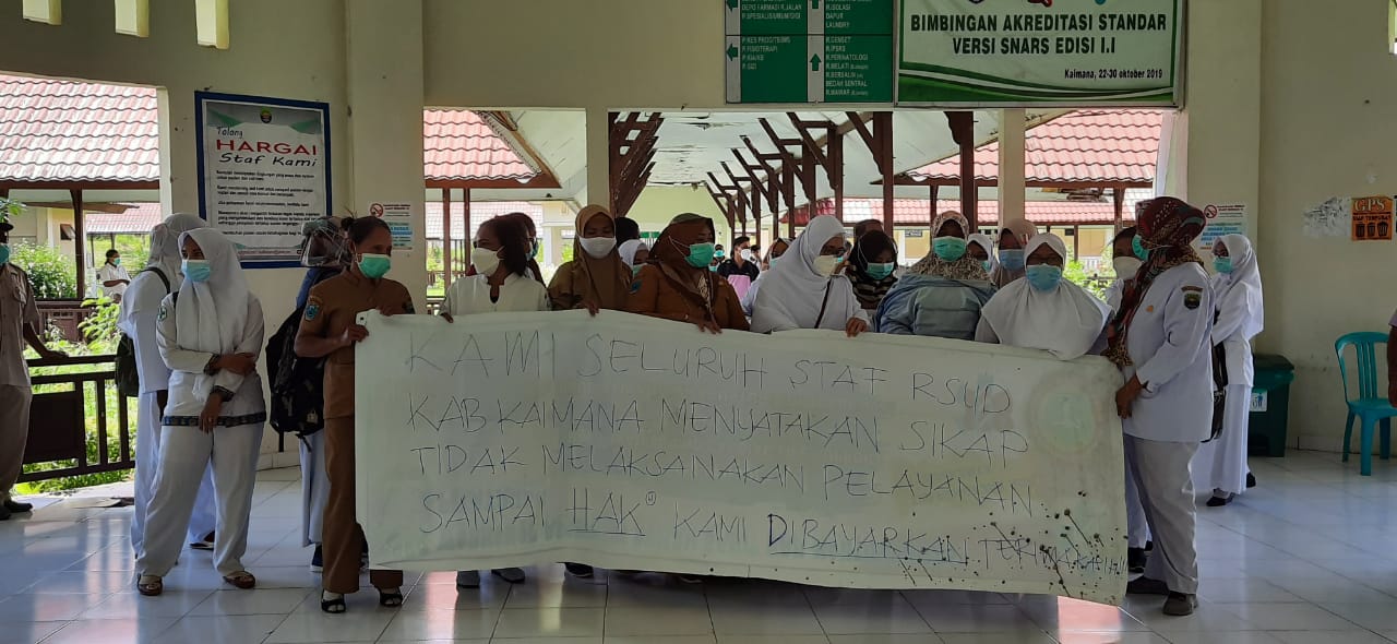 KAIMANA–Puluhan tenaga kesehatan di Rumah Sakit Umum Daerah (RSUD) Kaimana, Papua Barat, baik yang fungsional maupun non fungsional melakukan aksi mogok kerja karena belum ada kejelasan terkait pembayaran TPP pada Senin, (25/1/2021) pukul. 08.00. WIT.