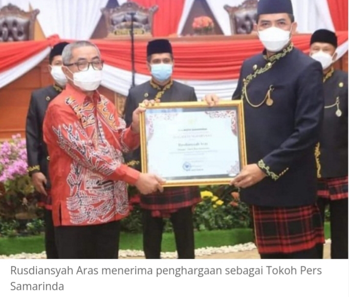 SAMARINDA–Kado istimewa diberikan Pemerintah Kota Samarinda kepada Rusdiasyah Aras. Saat Rapat Paripurna Istimewa Hari Jadi ke-354 Samarinda dan Pemerintah Kota Samarinda ke 62 di Gedung DPRD Samarinda, Senin (24/1/2022), Pemkot Samarinda memberikan penghargaan Tokoh Pers Samarinda.