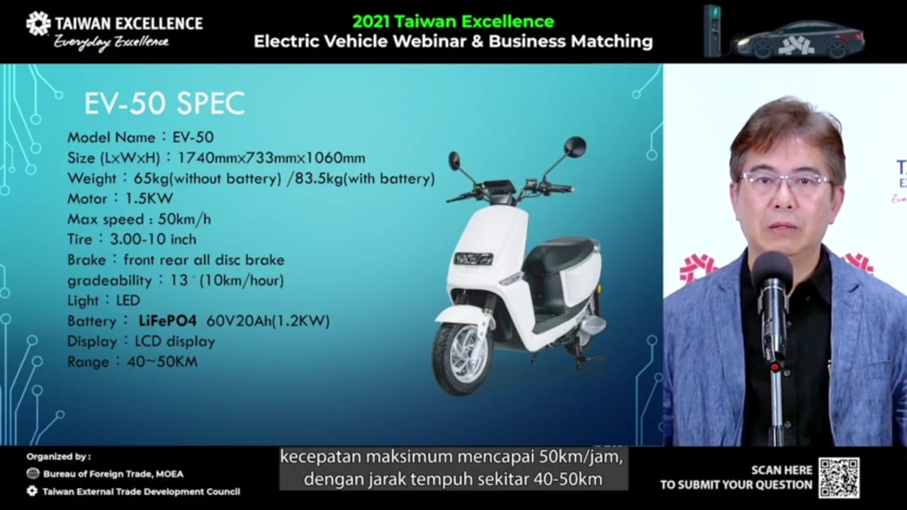 Sebanyak lima perusahaan yakni Delta Electronics, Teco Electric & Machinery, Chen Tech Electric, Kaison Green Energy Technology, dan Energy Moana Technology memaparkan keunggulan produk mereka dalam webinar yang diselenggarakan TAITRA (organisasi promosi perdagangan terkemuka di Taiwan) bekerjasama dengan INAPA (Pameran Suku Cadang, Aksesoris, dan Peralatan Otomotif Internasional Terbesar di ASEAN) di GoWork Menara Rajawali, Kuningan Timur, Jakarta Selatan, Rabu (24/3/2021).