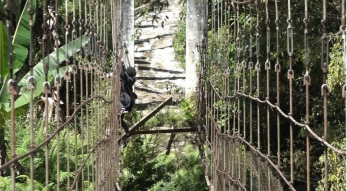 Kabar keberadaan jembatan ini diketahui setelah videonya viral di media sosial beberapa waktu lalu. Dalam video tersebut sejumlah pelajar bertaruh nyawa menyeberangi sungai dengan bergelantungan di tali jembatan gantung yang rusak parah. (thaya/sur)