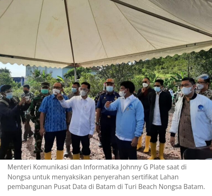 BATAM–Menteri Komunikasi dan Informatika Johnny G. Plate menyaksikan secara langsung penyerahan sertifikat lahan pembangunan Pusat Data di Batam dari Kepala BPN Provinsi Kepulauan Riau Nurhadi Putra kepada Pejabat Dirjen Kementerian Kominfo di Turi Beach Nongsa Batam, Jumat (24/6/2022).