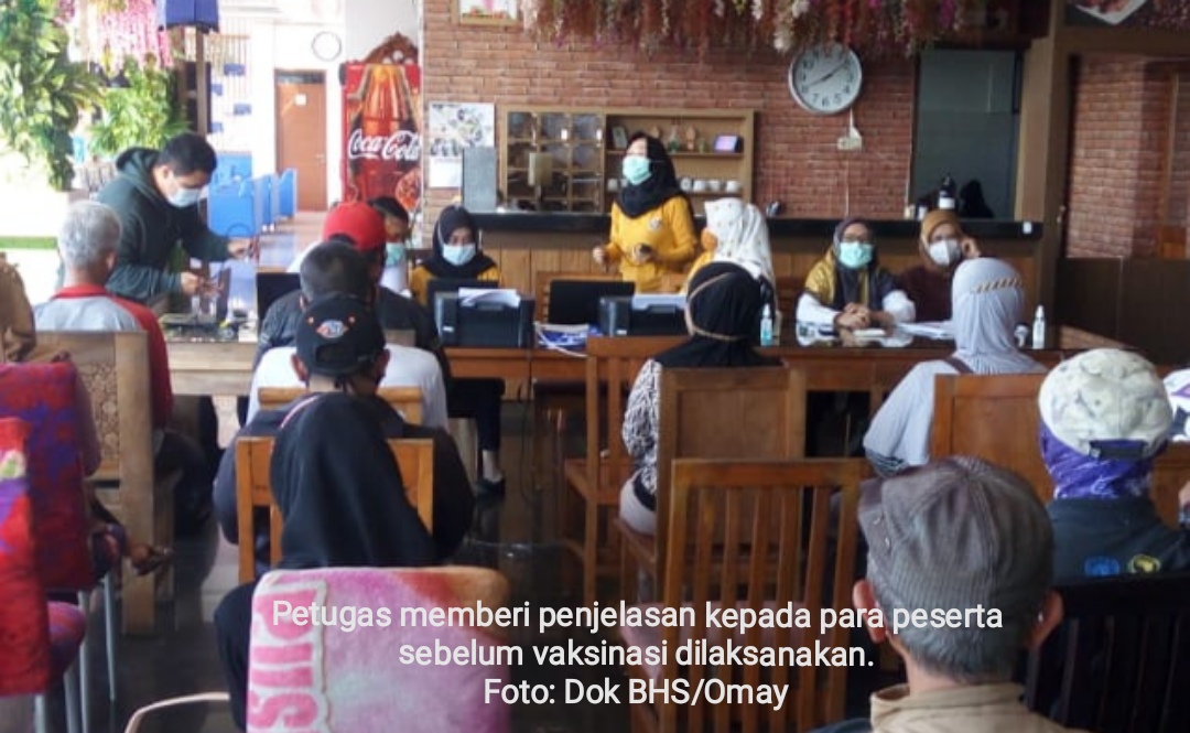 Vaksinasi berlangsung di lobi utama hotel & resto area pemancingan BHS di Jalan Blok Kalapa Dua, Bendungan, Sumedang, Jawa Barat.