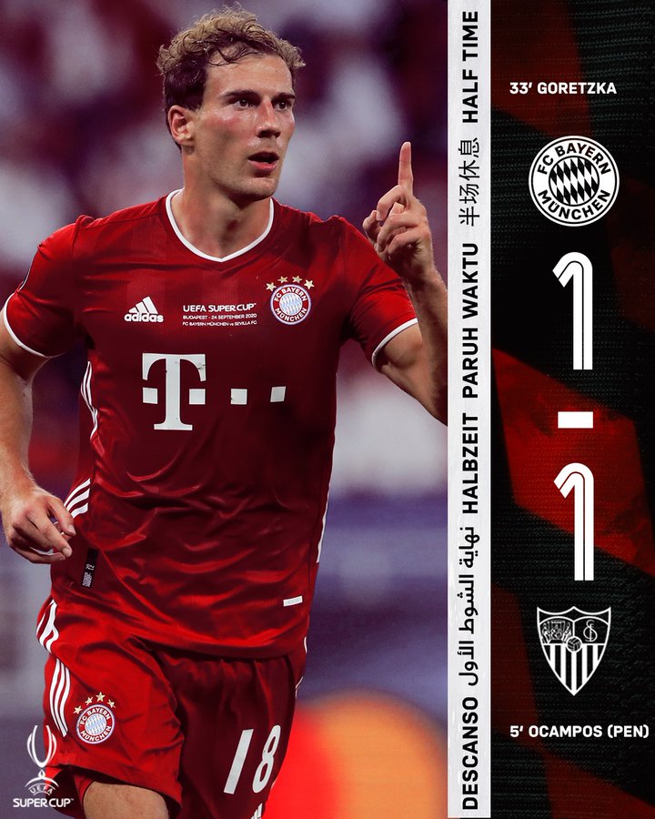 Los Nervionenses sempat mengejutkan usai mencetak gol pembuka melalui sepakan Ocampos via titik putih di menit 13. Tetapi Goretzka berhasil menyamakan skor sebelum babak pertama berakhir.