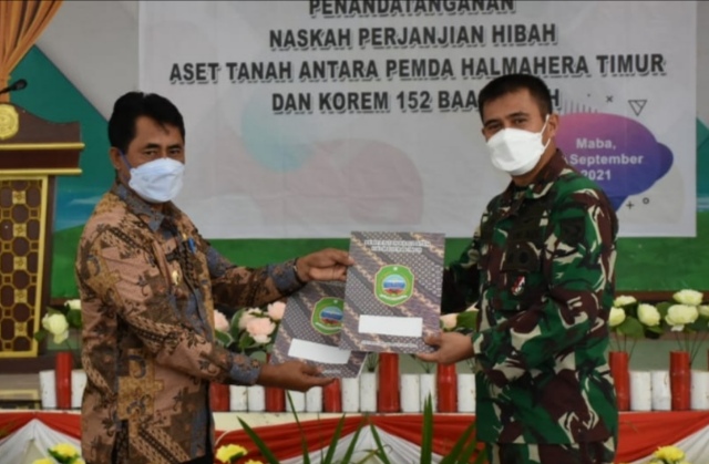 Penyerahan hibah itu tertuang dalam Naskah Penyerahan Hibah Daerah (NPHD) yang ditandatangani Bupati Halmahera Tengah dan Danrem 152/Baabullah di Aula Kantor Bupati Halmahera Timur.