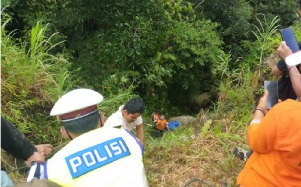 Sopir mencoba menghentikan laju kendaraan, sayangnya ban mini bus itu terseret di aspal selanjutnya ‘terjun bebas’ ke jurang dengan ke dalaman 200 meter.