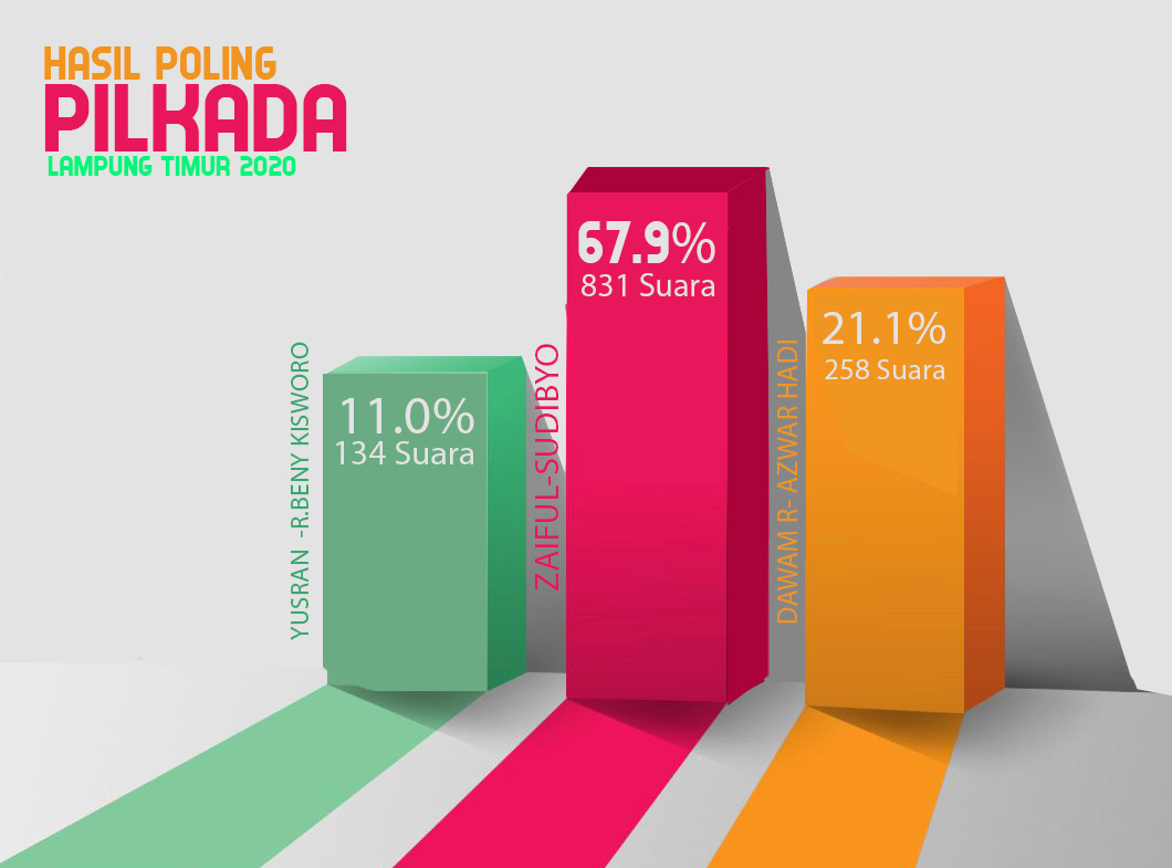 Untuk di Lampung Timur, paslon petahana Zaiful Bukhari-Sudibyo unggul dengan 32,75 persen. Di posisi kedua ada paslon Yusran Amirullah-Beni Kisworo dengan 30,16 persen dan Dawam Rahardjo-Azwar Hadi dengan angka 25,68 persen. Kemudian, ada 11,41 persen suara yang masih belum menentukan pilihannya.