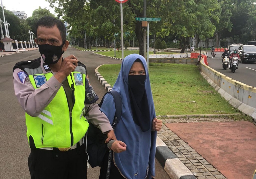 Setelah ditangkap Paspampres, perempuan bersenjata api diserahkan ke polisi lalu lintas yang bertugas di depan Istana. (Ist)