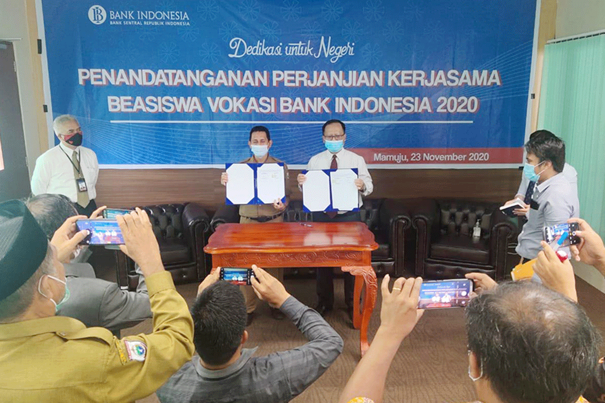 MAMUJU – Kantor Perwakilan Bank Indonesia (KPw BI) Provinsi Sulawesi Barat menggelar seremoni penandatanganan perjanjian kerja sama beasiswa vokasi dengan delapan Sekolah Menengah Kejuruan (SMK) di Sulawesi Barat, Senin (23/11/2020).