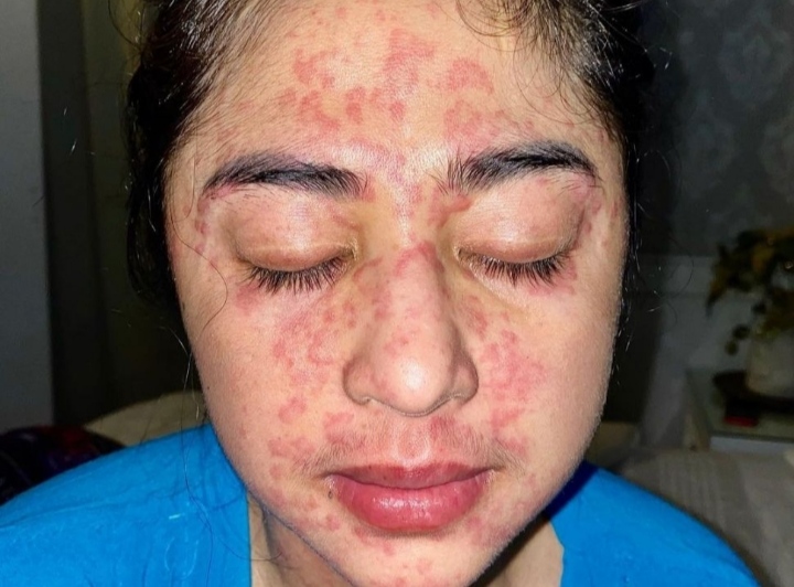 Wajah dan bagian atas tubuhnya yang tampak pada foto itu dipenuhi bercak merah, ruam, semacam bentol-bentol pipih.