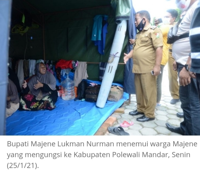 MAJENE – Bupati Majene Lukman melakukan kunjungan ke Kabupaten Polewali Mandar untuk menemui warga Kabupaten Majene yang mengungsi karena terdampak guncangan gempa bumi pada Kamis (14/01/21) lalu.