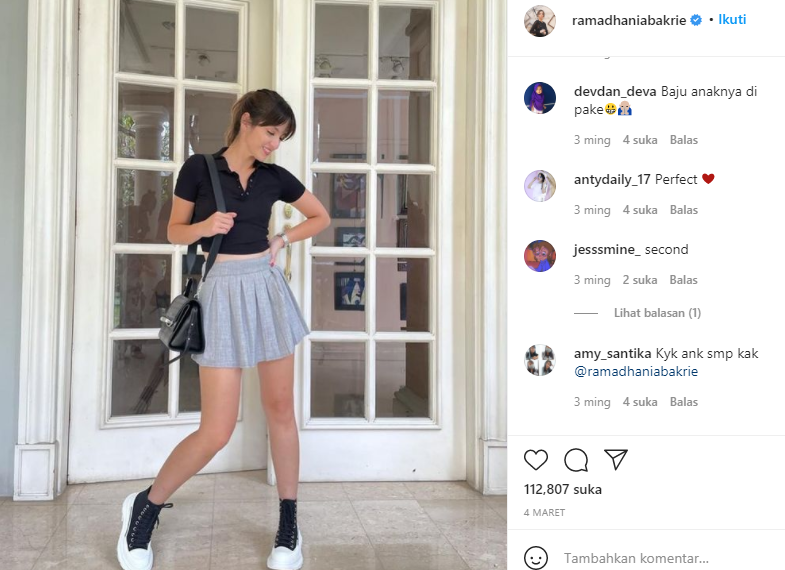 Dalam salah satu unggahan di Instagram, ibu tiga anak ini tampil dengan kaus polo warna hitam yang dipadukan dengan rok mini berwarna biru muda, seperti dilansir Insertlive, Jumat (26/3/2021).