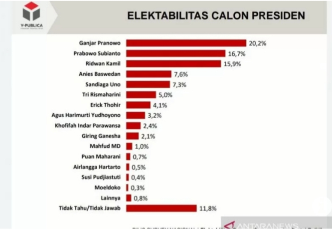 JAKARTA–Hasil survei yang dilakukan oleh Y-Publica menunjukkan elektabilitas Gubernur Jawa Tengah Ganjar Pranowo menembus 20,2 persen untuk pertama kalinya sejak survei Maret 2020.