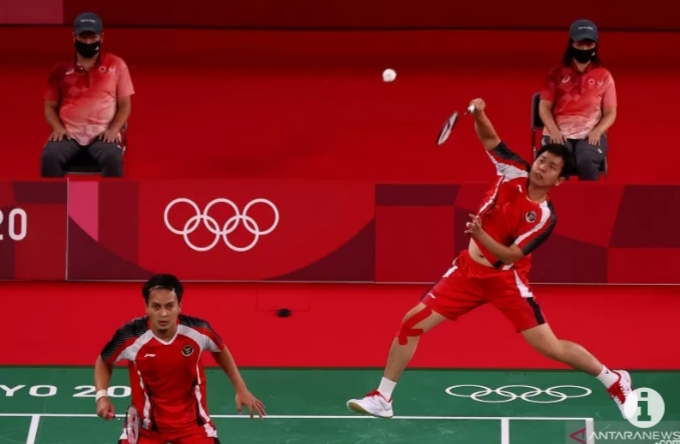 TOKYO–Ganda putra Hendra Setiawan/Mohammad Ahsan berhasil mengatasi tekanan pasangan Aaron Chia/Wooi Yik Soh dalam penampilan kedua mereka di babak penyisihan Grup D Olimpiade Tokyo 2020, Senin.