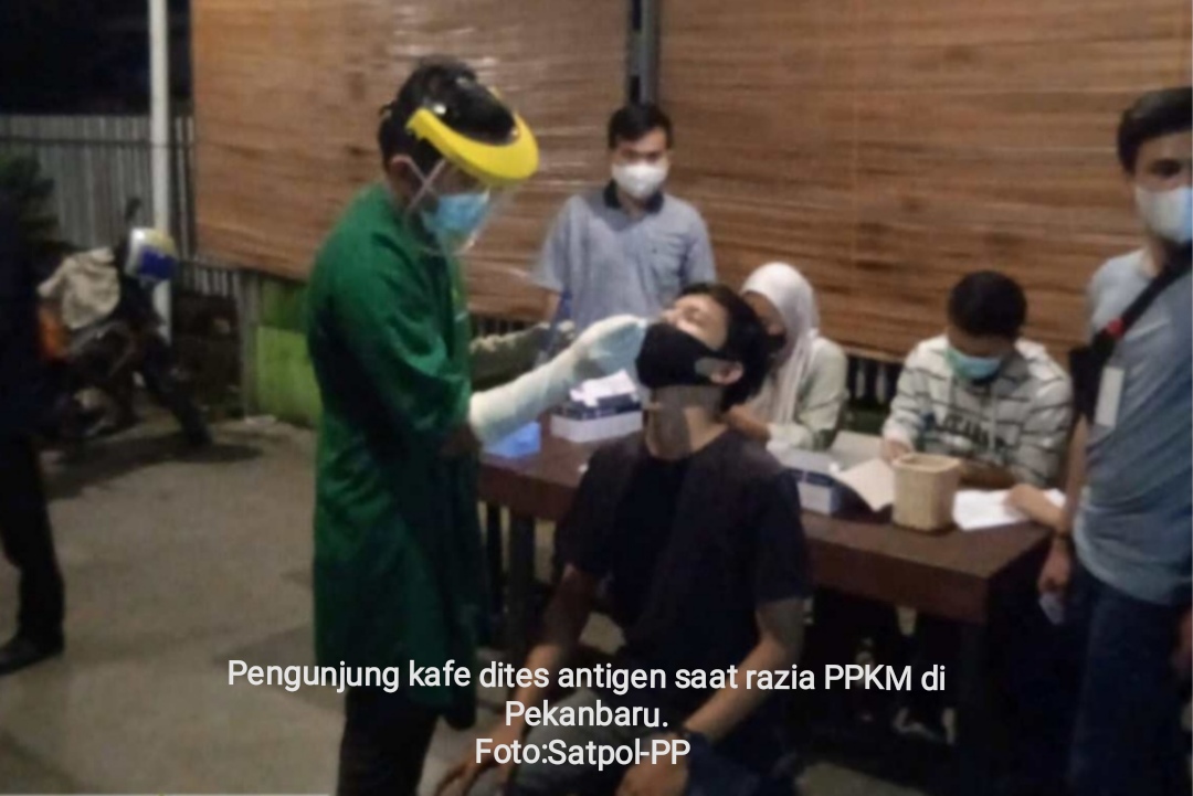 PEKANBARU – Tiga pengunjung kafe diketahui reaktif Covid-19 setelah dites swab antigen. Mereka terjaring dalam razia yang digelar Satgas Covid-19 Kota Pekanbaru, Sabtu (24/7/2021) malam.