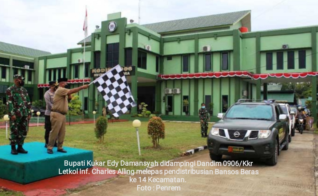 TENGGARONG – Dandim 0906/Kkr Letkol Inf Charles Alling mendampingi Bupati Kutai Kartanegara Edy Damansyah melepas pendistribusian Bantuan Sosial (Bansos), Senin (23/8/2021).