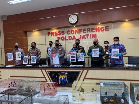 SURABAYA – Tindak pidana tertentu (tipiter) berupa melawan perbuatan hukum dengan cara melakukan penjualan pada konservasi sumber daya alam hayati dan ekosistemnya. Hal itu diungkap dalam konferensi pers Polda Jatim yang dipimpin Wadir Krimsus Polda Jatim, AKBP Zulham Effendy dengan didampingi Kabid Humas Polda Jatim, Kombes Pol Dirmanto bersama BBKSDA Jatim dan Kanwil IV KPPU di Mapolda Jatim, Surabaya. Jumat, (26/8/2022).