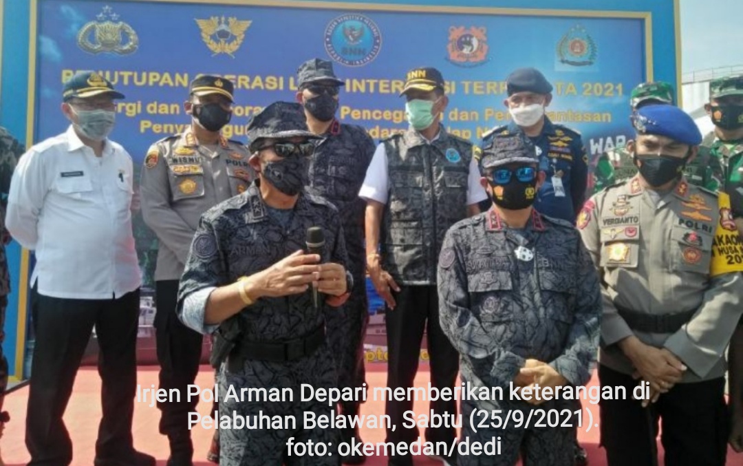 MEDAN – Deputi Pemberantasan Badan Narkotika Nasional (BNN), Irjen Pol Arman Depari memimpin penutupan Operasi Laut Interdiksi Terpadu di Pelabuhan Ujung Baru, Dermaga 103, Belawan, Kota Medan, Sabtu (25/9/2021).