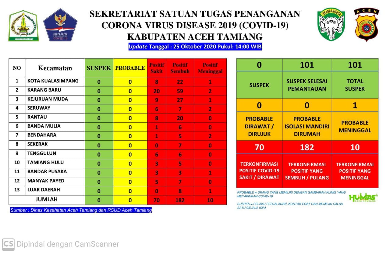 Satgas Covid-19 Aceh Tamiang merincikan, 182 orang sembuh, 70 masih terkonfirmasi positif Covid-19, dan 10 meninggal.