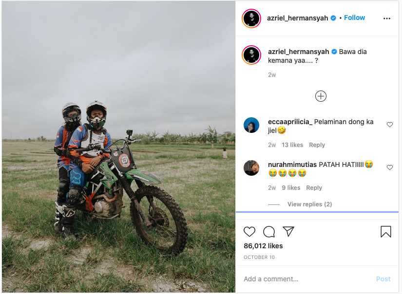 “Bawa dia kemana yaa…. ?” tulis Azriel dalam caption foto saat nak motocross bersama Sarah dikutip dari beepdo.com grup Siberindo.co, Senin (26/10/2020).