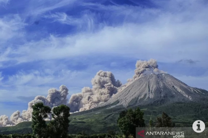 MEDAN – Badan Penanggulangan Bencana Daerah Kabupaten Karo, Sumatera Utara, menyatakan Gunung Sinabung Erupsi pada Sabtu sekitar pukul 12.00 WIB ditandai dengan luncuran guguran awan panas teramati dengan jarak 1.000 meter yang mengarah ke timur dan tenggara.