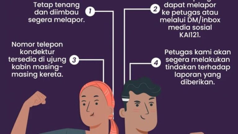 JAKARTA–Segera melapor ke kondektur bila mengalami pelecehan seksual di atas Kereta Api. Petugas akan segera melakukan tindakan tegas terhadap laporan yang diberikan.