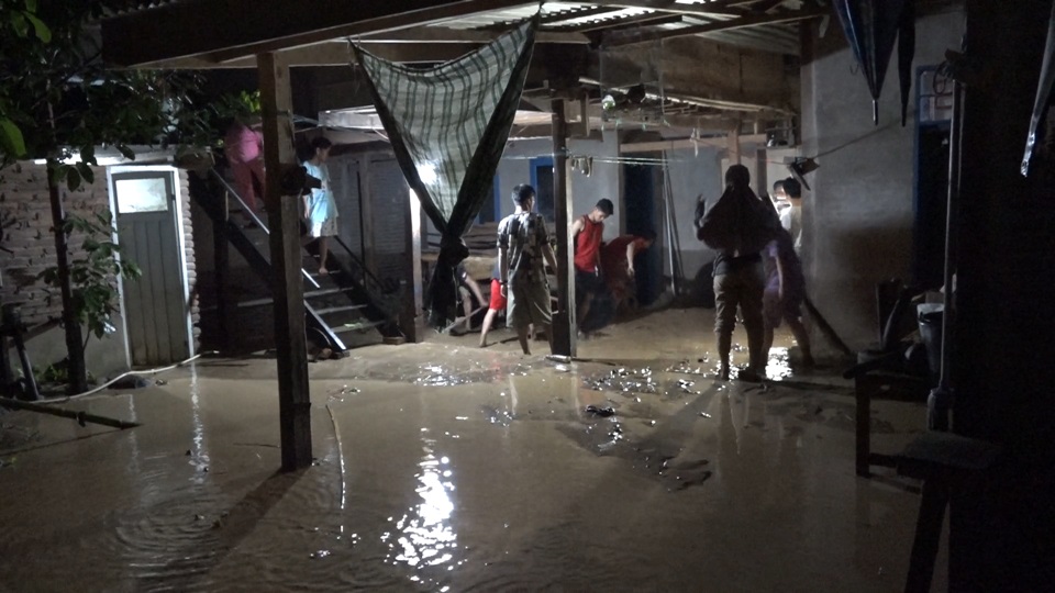 “Banjir terjadi mulai jam enam sore. Kira-kira tiga jam saja sudah surut. Tetapi ini yang paling parah, barusan air masuk di sini,“ ungkap Baharuddin sembari menyingkirkan material lumpur setebal tiga puluh sentimeter yang memenuhi ruangan rumahnya.