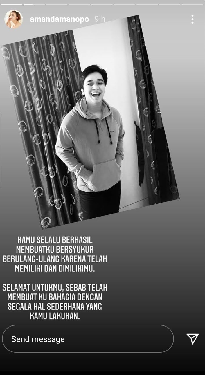 “Kamu selalu berhasil membuatku bersyukur berulang-ulang karena telah memiliki dan dimilikimu,” tulis Amanda lewat postingan instagram stories bersama dengan foto Billy yang tengah tersenyum lebar.
