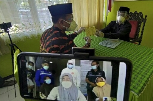 Sang ayah yang sedang isolasi mandiri menyerahkan kuasa wali nikah kepada Kepala KUA yang bertindak sekaligus sebagai penghulu. (*)