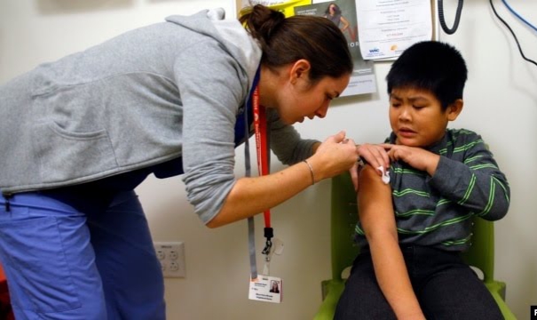 Nga Ngyen, tujuh tahun, mendapat suntikan vaksin influenza dari perawat Maya Kahn-Woods di sebuah klinik perawatan kesehatan, di Boston, Massachusetts. (Foto: Reuters)