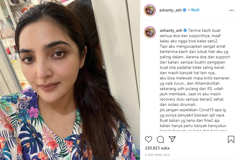 “Aku bisa melewati masa kritis kemaren yang naik turun.. dan Alhamdulillah sekarang udh pulang dari RS, udah jauh membaik.. saat ini aku masih recovery dulu sampai benar2 sehat, dan isolasi di rumah,” tulis Ashanty.