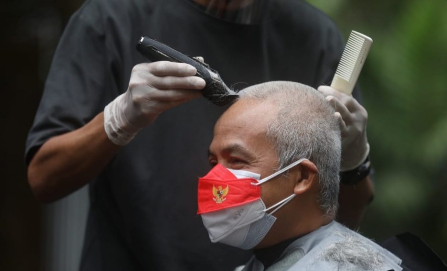SEMARANG – Gubernur Jawa Tengah Ganjar Pranowo menepati janjinya cukur gundul dalam gerakan Berani Gundul 2022, Senin (28/2/2022).