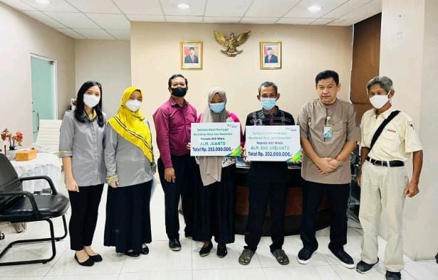 JAKARTA–BPJamsostek Kantor Cabang Tangerang Cikokol memberikan santunan Jaminan Kecelakaan Kerja (JKK) dan Jaminan Kematian (JKM) kepada para ahli waris diantaranya ahli waris alm juanto dan ahli waris alm eko ardianto yang berkerja di jasa kontruksi pada PT Pulau Intan Proyek UBM.