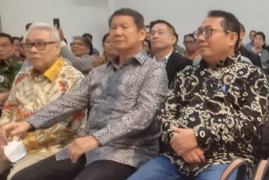 Wakil Ketua Dewan Pembina Partai Gerindra Hashim Sujono Djojohadikusumo bersama Ketua Umum SMSI Firdaus dan Ketua Umum Vox Point Yohanes Handoyo Budhisedjati. (Foto: Henny Murniati)