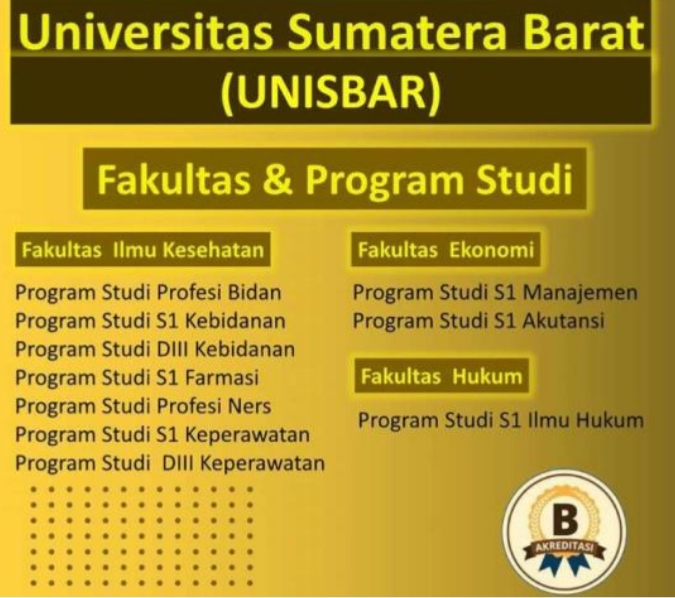 Dalam persentasinya, Dr. Hj. Nurtati, SE.,MM menyampaikan, bahwa ketiga kampus dikelola oleh tiga Yayasan, yaitu STIE SUMBAR Pariaman dibawah Yayasan LP3 Esida, Stikes Nan Tongga dibawah Yayasan Nan Tongga dan Stikes Sumbar Lubuk Alung di bawah Yayasan Pendidikan Sumatera Barat (YPSB) Padang. Kemudian, ketiga Yayasan tersebut digabungkan dalam satu Yayasan Pendidikan Sumatera Barat (YPSB) Padang dan ketiga Sekolah Tinggi menjadi Universitas Sumatera Barat (UNISBAR). Universitas yang terletak di By Pass Kota Pariaman ini memiliki 3 Fakultas, yaitu Fakultas Ekonomi: Jurusan Ekonomi dan Akuntansi, Fakultas Kesehatan: Keperawatan, Farmasi, D3 Kebidanan, Keperawatan, Farmasi, Kebidanan, Profesi Ners dan Profesi Bidan serta Fakultas Hukum: Ilmu Hukum. Seluruh Program Studi/Jurusan dan Institusi telah Terakreditasi B, jadi UNISBAR memiliki dua Jurusan D3, enam Jurusan S1 dan dua Jurusan Profesi.