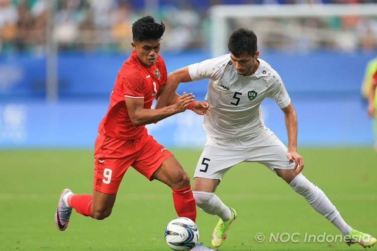 Pemain Timnas Indonesia U-24 Ramadan Sananta saat dihentikan pemain Uzbekistan. (NOC Indonesia)