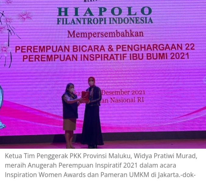 JAKARTA–Ketua Tim Penggerak PKK Provinsi Maluku, Widya Pratiwi Murad, meraih Anugerah Perempuan Inspiratif 2021 dalam acara Inspiration Women Awards dan Pameran UMKM di Gedung Perpustakaan, Jakarta.