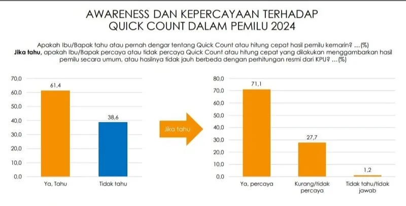 Terungkap dalam Temuan Survei Nasional: Evaluasi Publik Atas Pemilu 2024 dan Isu-isu Terkini yang dirilis di Jakarta, Rabu, 61,4% responden mengenal quick count, dan sebagian besar dari mereka (71,1%) percaya metode ini mencerminkan hasil pemilu secara umum.