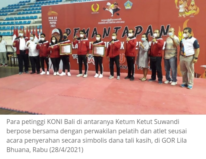 Penyerahan dana tali kasih kepada atlet dan pelatih PON diserahkan secara simbolis oleh Ketua Umum KONI Bali Ketut Suwandi di GOR Lila Bhuana Denpasar, Rabu (28/4/2021) dirangkai dengan acara Pemantapan Pelatda Bali PON XX Papua.