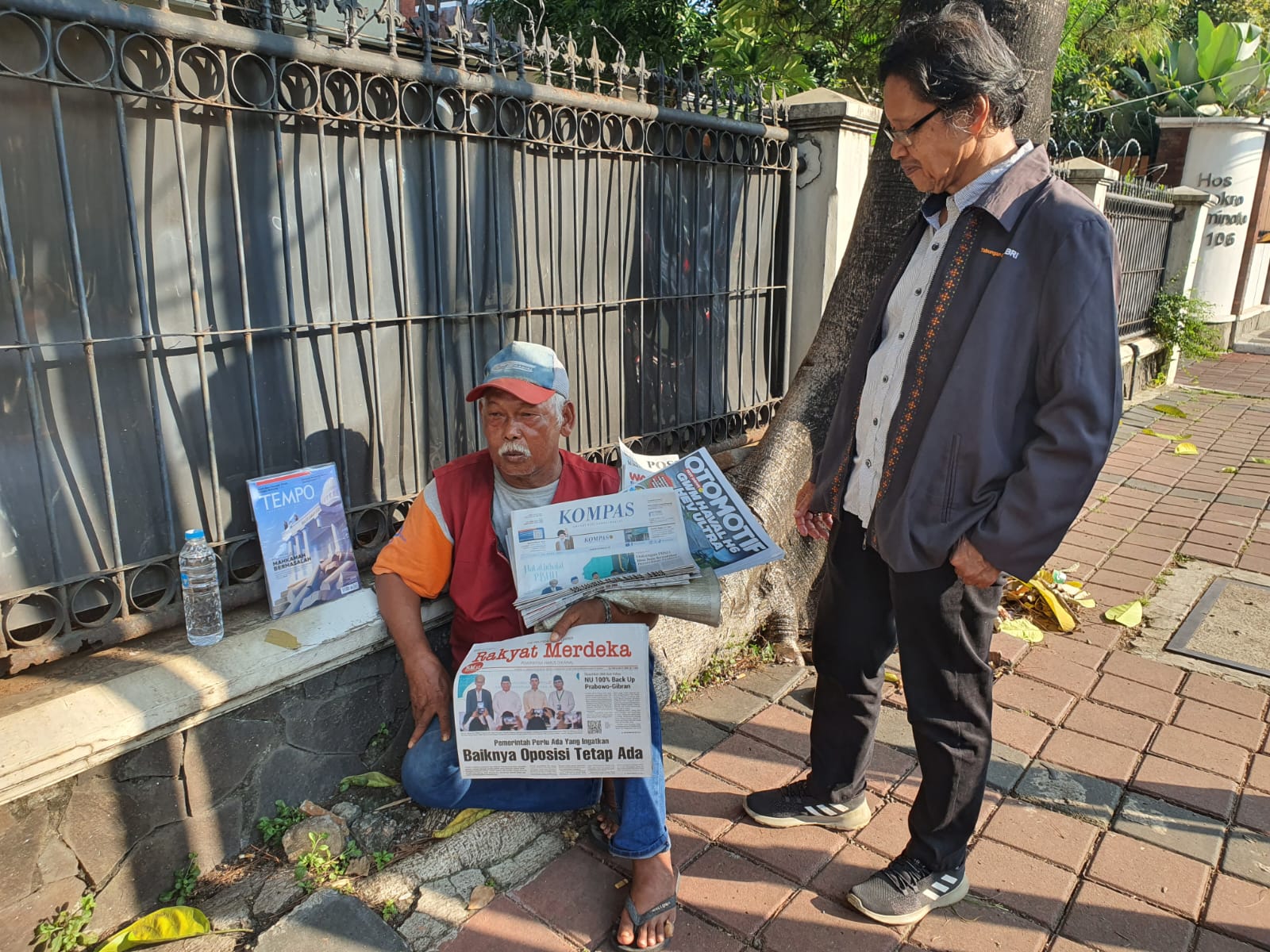 Di kawasan kuningan Jakarta, di antara gemerlapnya lampu dan kesibukan kendaraan bermotor, seorang lelaki berusia 70-an tahun duduk merengkuh di trotoar. Namanya Saiman, di hadapannya terhampar puluhan eksemplar koran.