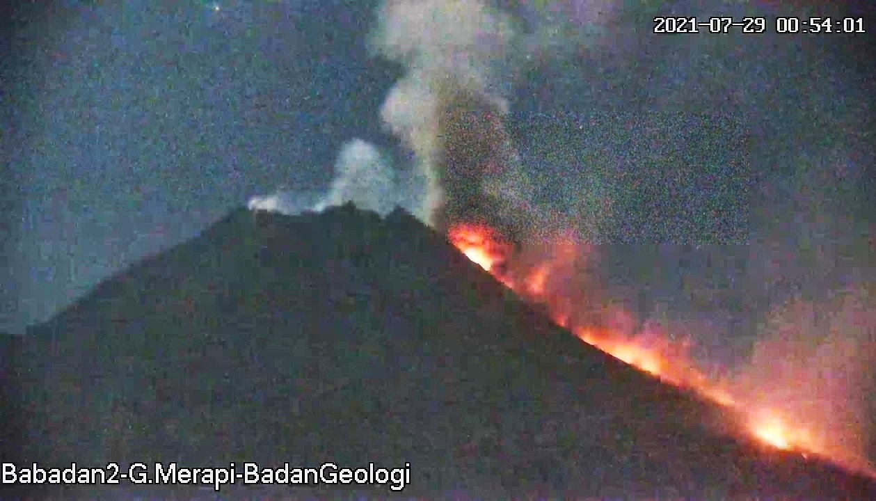Di Jawa, Merapi di perbatasan Jawa Tengah dengan Daerah Istimewa Yogyakarta, Kamis (29/7/2021) dini hari kembali menggugurkan awan panas.