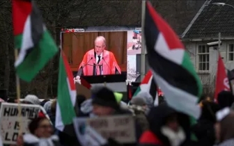 Sidang Mahkamah Internasional (ICJ) ditayangkan di jalan-jalan ketika demonstran pro-Palestina protes di dekat lokasi, di Den Haag, Belanda 11 Januari 2024. (REUTERS/Thilo Schmuelgen)