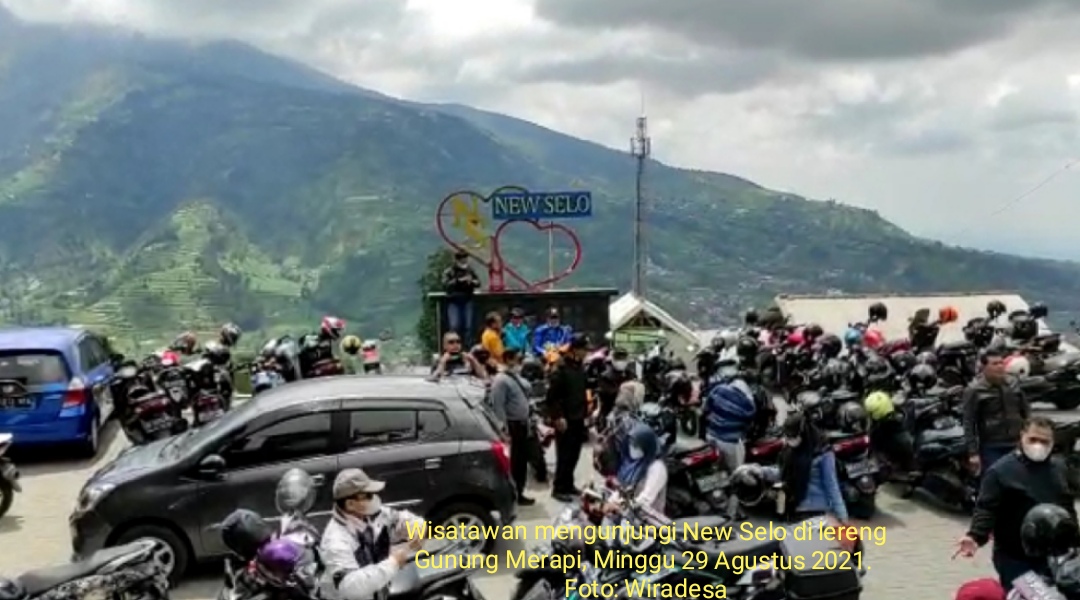 Pada Minggu 29 Agustus 2021, tampak ratusan wisatawan, kebanyakan berkendara sepeda motor memadati area parkir di sekitar spot foto tertulis New Selo.
