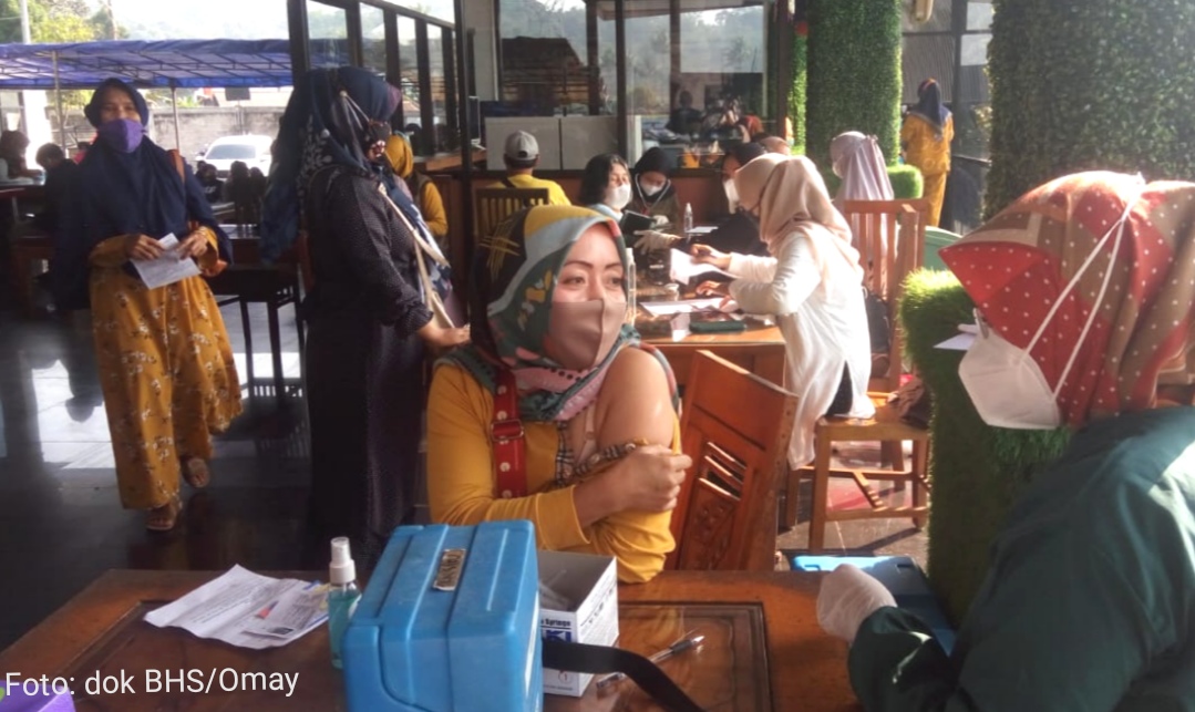 Vaksinasi berlangsung di lobi utama hotel & resto area pemancingan BHS di Jalan Blok Kalapa Dua, Bendungan, Sumedang, Jawa Barat.