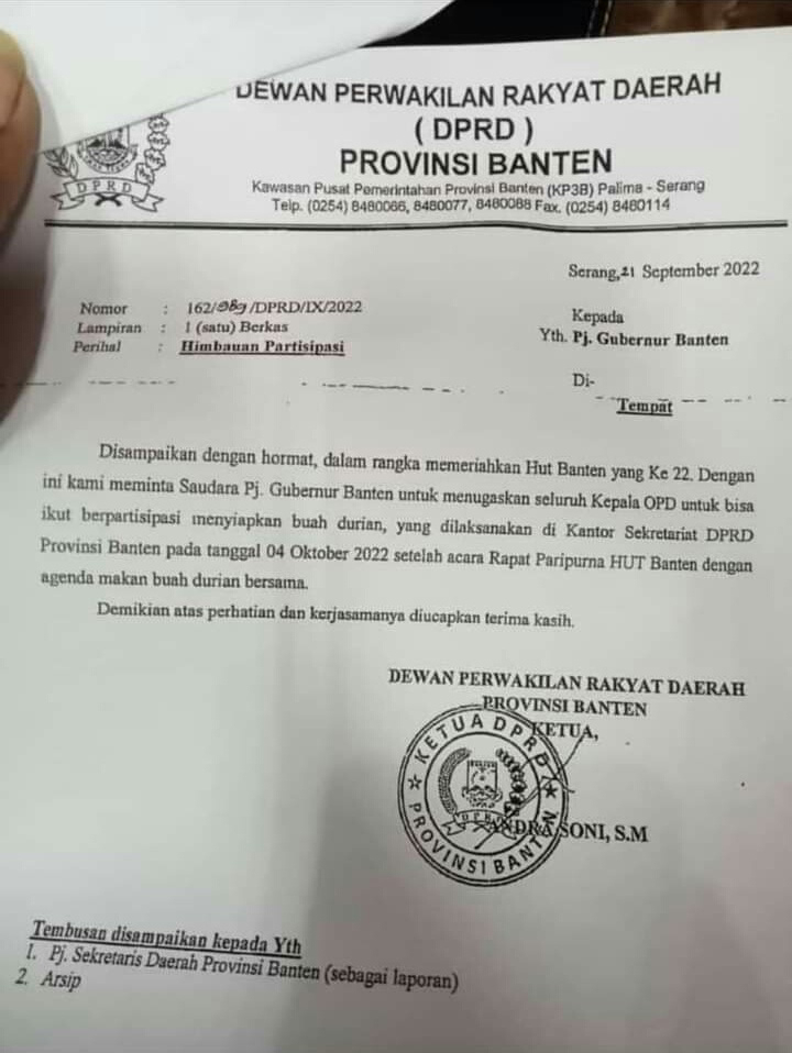 Dalam surat tersebut dinyatakan agar OPD menyiapkan durian untuk dimakan bersama dalam acara yang dilaksanakan di Sekretariat DPRD Banten pada 4 Oktober 2022 usai rapat paripurna HUT Banten.
