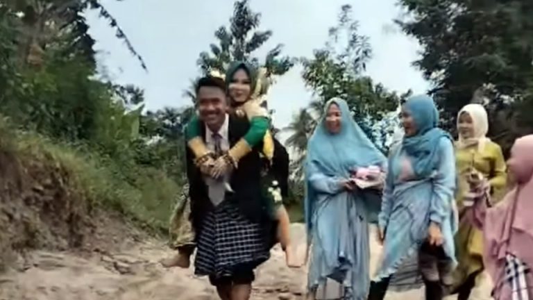 POLMAN–Seorang pria di Kabupaten Polewali Mandar, Sulawesi Barat, terpaksa menggendong istrinya menyeberangi sungai karena ketiadaan jembatan. Detik-detik aksi pengantin baru itu terekam kamera hingga viral di media sosial.