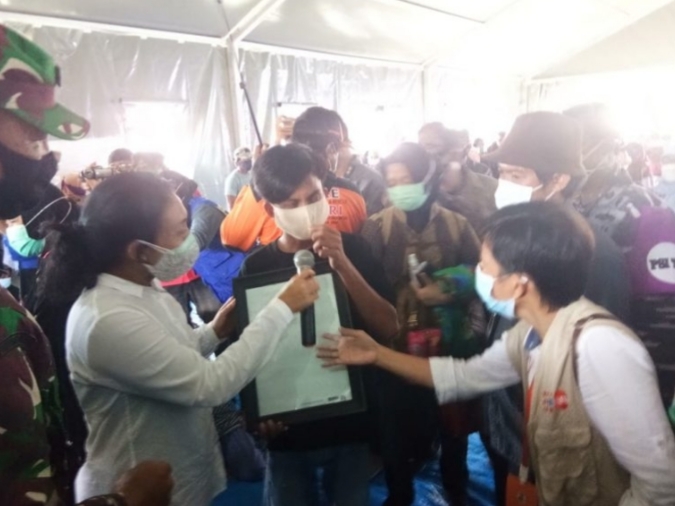 “Apa yang menginspirasimu membuat gambar ini,” tanya Menteri PPPA. “Saya terinspirasi dari banyaknya ibu-ibu yang menangis ketika mencari tempat berlindung saat gempa di Mamuju,” jawab Ilham.