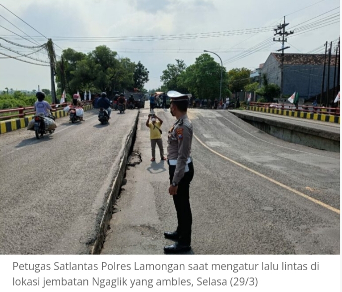 “Kita melaksanakan pengalihan arus dan pengaturan lalu lintas di lokasi sepanjang jalan nasional dekat lokasi. Koordinasi dengan Polres Gresik dan Polres Tuban untuk melaksanakan pengalihan arus Pantura dan arah Mojokerto,” kata Rangga di lokasi jembatan yang ambles.