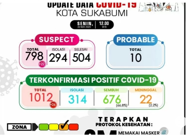 Wahyu mengatakan hingga saat ini status Kota Sukabumi masih berada di di zona oranye COVID-19. Maka dari itu agar tidak meningkat menjadi zona merah, warga diimbau agar terus meningkatkan disiplinan dalam menerapkan protokol kesehatan.