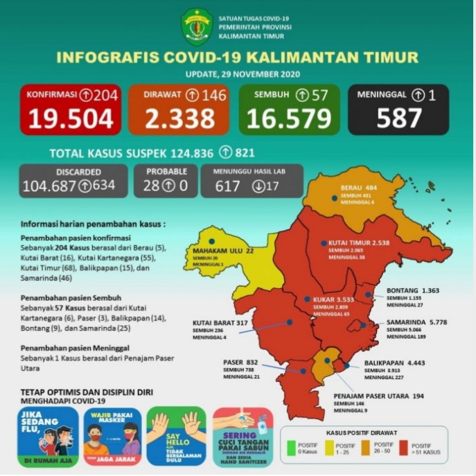 Update perkembangan Covid-19 Kaltim, Minggu per 29 November 2020, suspek total 124.836 kasus (tambah 821 kasus), discarded/suspek negatif 104.687 kasus (tambah 634 kasus), probable 28 kasus dan proses 617 kasus. Meninggal 587 kasus dan dirawat 2.338 kasus. (red)