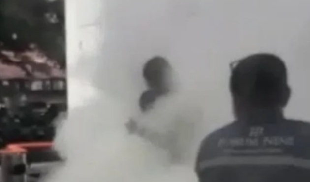 Petugas keamanan gedung yang melihat kejadian itu lantas menyiramkan alat pemadam api ringan ke tubuhnya.
